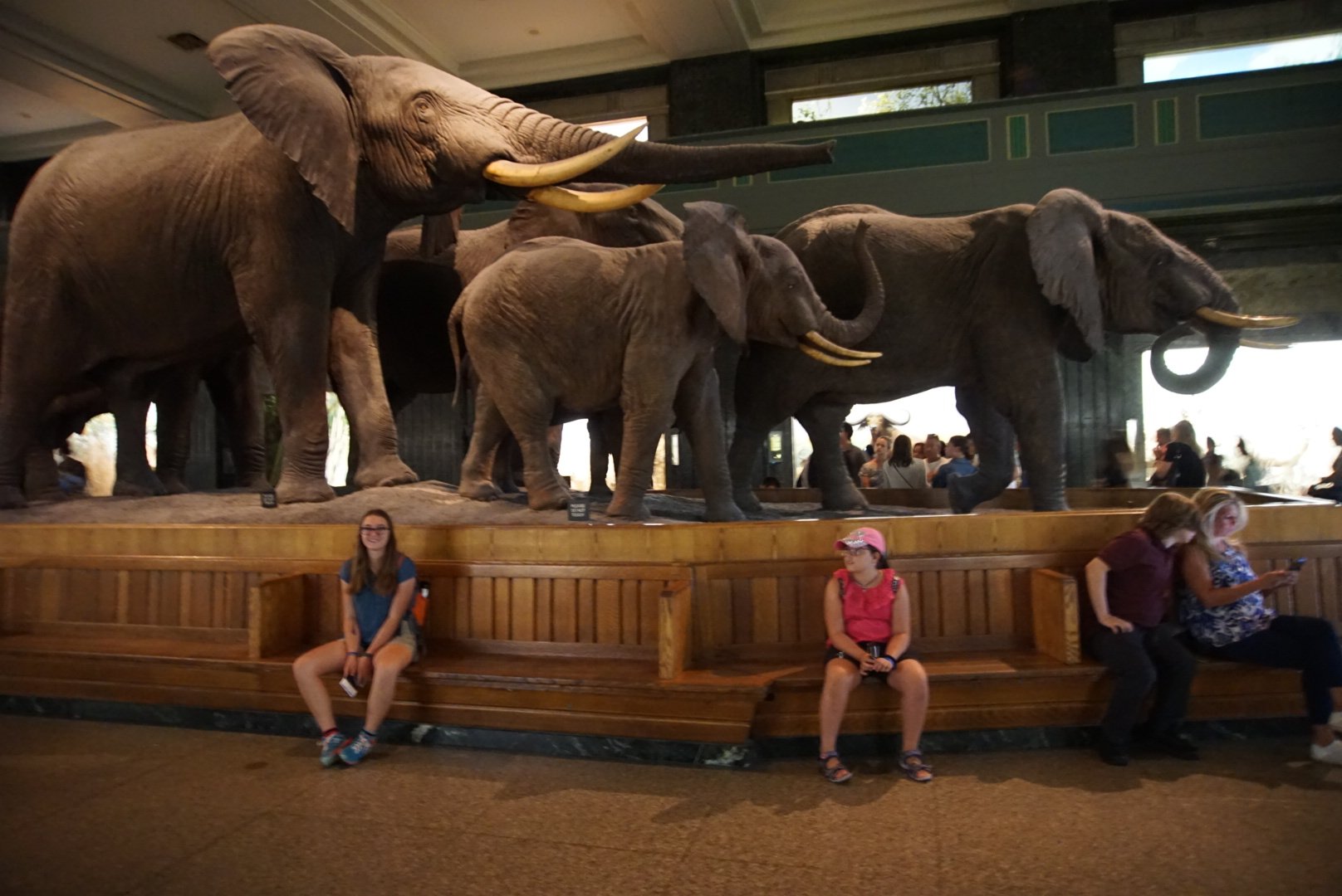 Soudain, des monsieurs** sont arrivés, nous donnant des instructions et nous expliquant que la file, c’est un security check. Par la suite, on pourra passer vite si on a nos billets électroniques. Alors n’écoutant que mon courage, je suis allée lui dire que j’avais un problème avec mes ebillets. Que je n’avais que mes ID de billets en photo.Ben savez-vous quoi? Il nous a fait passer toute la file qui commençait seulement à entrer et on est allé voir une madame qui nous a toutte arrangé ça! Nous avons été dans les 10 premières personnes à entrer dans le musée!! (Et zéro security check!!)Vous savez ce que vous avez à faire pour passer vite!!😉 j’ai rien dit moi par exemple!!!Quoi dire sur le musée? C’est gigantesquement allucinant! Nous y sommes restées toute la journée, avons à peine pris quelques minutes de pause pour luncher en punition sur un banc ( je vous expliquerai plus bas) et avons vu toutes les expositions/activités spéciales. Du cosmos avec Neil au fond des mers abyssales en passant par des scènettes mettant en vedette toutes sortes d’animaux grandeur nature. Y a pas à dire, ce musée en mène large dans toute la largeur du vivant (empaillé) possible et jusqu’à l’infini!!!Si vous avez une once d’enfant en vous, il faut le laisser s’amuser, s’emerveiller en masse. Il sera servi!! Sacha a adoré la salle des éléphants qui regroupe les animaux d’Afrique. En son centre: des éléphants grandeur nature!