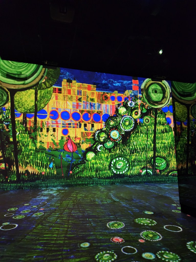 C’est un autre artiste de Vienne qui a volé la vedette au headliner! Un dénommé Hundertwasser. Artiste extrêmement coloré dans ses coloris (et il semblerait dans ses états torturés selon le monsieur à l’accueil, super gentil, qu’on a rencontré à la sortie et qui parlait un français impeccable). Hundertwasser donc, dont les oeuvres étaient aussi projetées à la suite de celles de Klimt, sont magnifiques et tellement originales! Un coup de coeur et une investigation à venir!