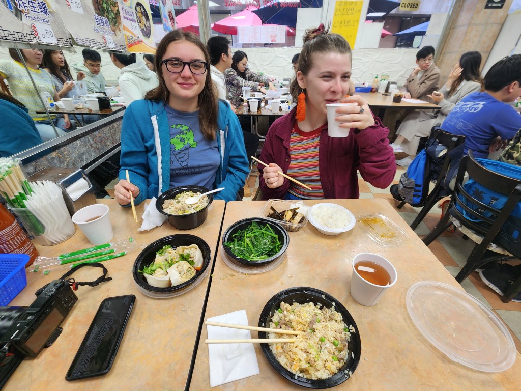 Alors on marche un peu dans cette mini rue pour trouver, à quelques jets de pierre, un joli resto, toute écriture en chinois et tout occupants idem. Go! On y va!! On voulait manger du chinois? On a mangé du taiwanais. On dirait un mélange de chinois et de coréen avec des riz frits et des kimchi. Vraiment bon et vraiment généreux. On en avait trop évidemment. Une chance que tout était servi dans des plats pour apporter (bizarre cette pratique mais bon…)