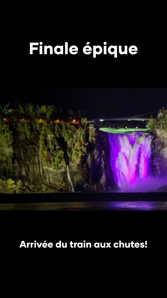 Il ne faut pas négliger l’arrivée grandiose avec les chutes illuminées! En arrivant avec le train, nous étions aux premières loges pour les admirer. Ah oui! J’ai oublié de vous dire que nous avons fait le voyage de retour à reculon aussi.
