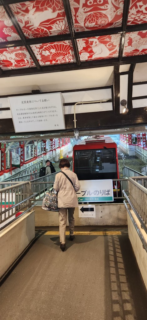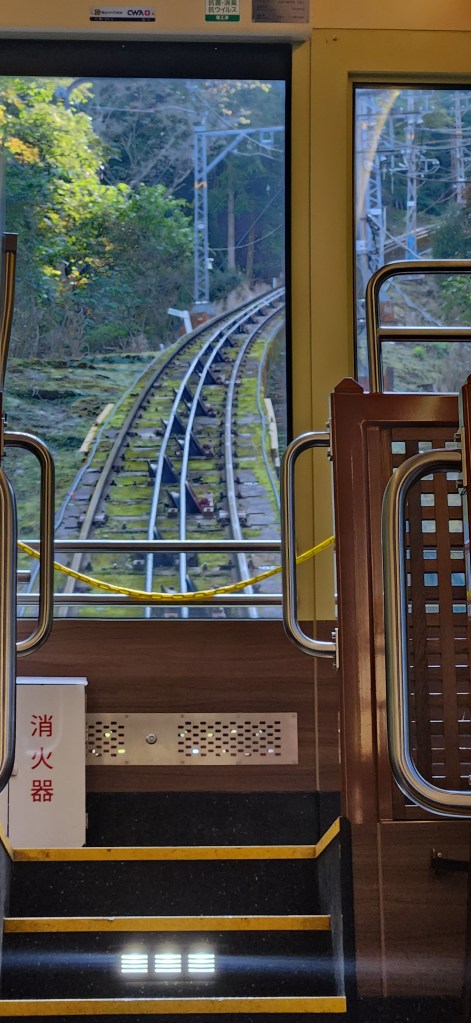Pendant que je n’en peux plus de m’ébahir, on continue de monter. Mais le train n’en peut plus. Il faut donc changer pour un « cable car ». Oui! Une wagon presque vertical qui est tiré par un cable. Au fond de la forêt, dans les montagnes. On monte le mur pendant un très gros 10 minutes.