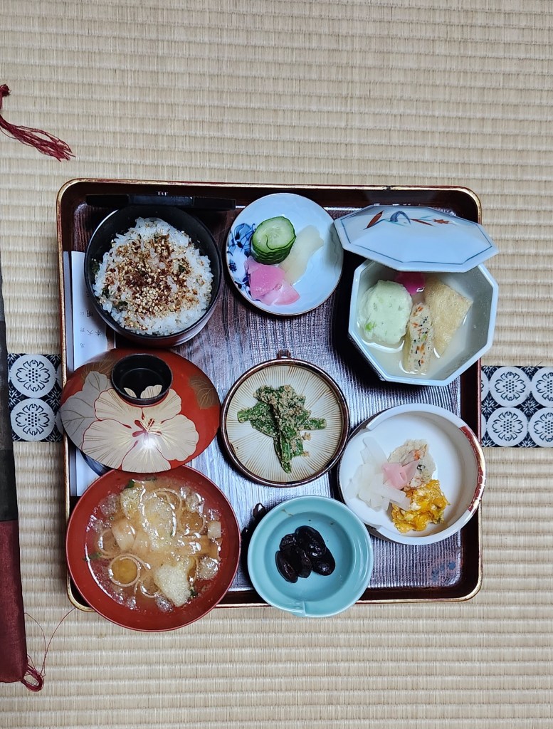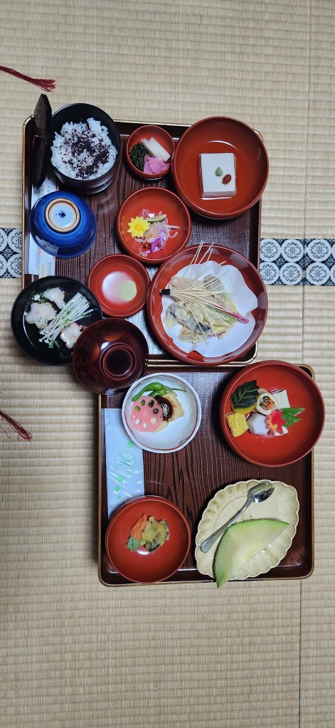 Les deux repas que nous aurons pendant notre séjour consiste en une multitudes de petits plats (comme dirait Sacha, ça fait beaucoup de vaisselles à laver…) avec de petites portions de toutes sortes. Du tofu, des légumes marinés, du riz assaisonné, des fèves sucrées, des légumes enrobés de noix, etc. Le tout accompagné d’un excellent thé genmaicha. Un de mes préférés.