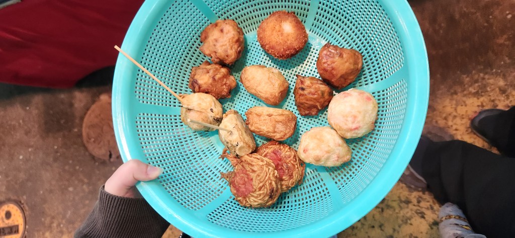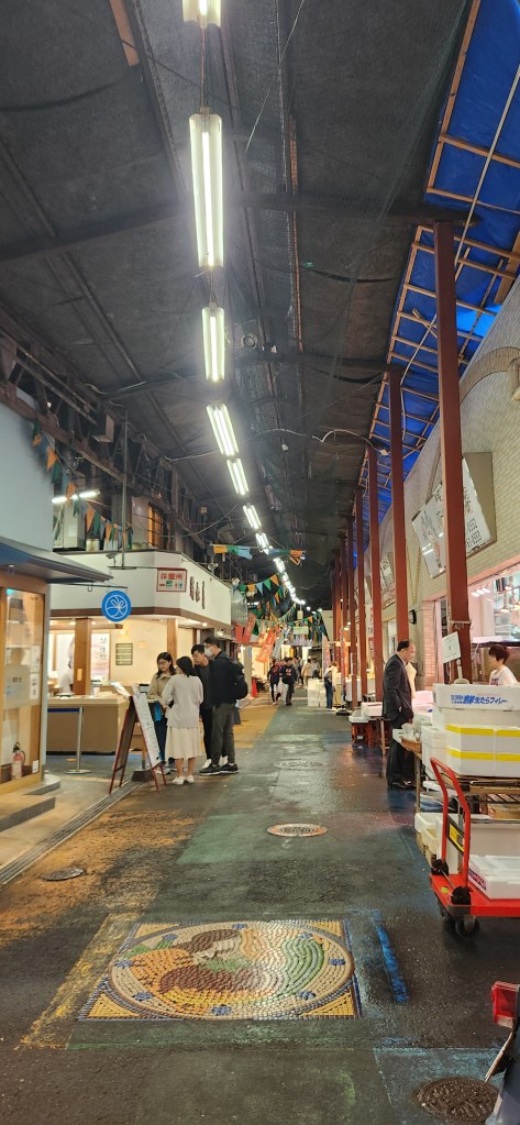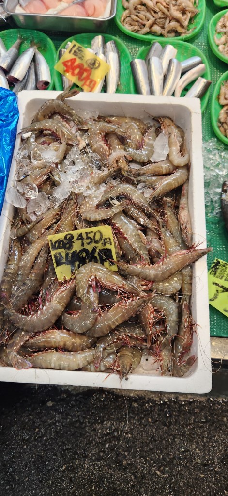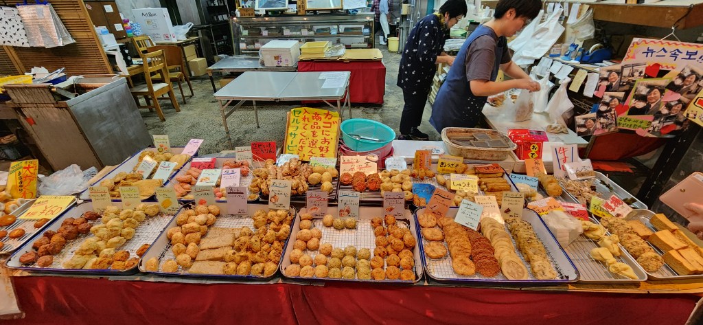 Il y a un petit marché de poissons ici à Fukuoka, pas trop sur la trail touristique, qui n’ouvre que de 8:00 à 10:00. Les jours de semaine. Une petite rue et quelques embranchements où les marchands offrent leurs catch of the day et autres marchandises connexes. C’était cool de se retrouver dans ce petit marché tout typique. Nous y avons dégotté un marchand qui vend des boules frites de diverses saveurs. On a pas pu y résister. On s’est fait un échantillon en mode petite dégusse (mot importé d’un voyage en France, entendu justement dans un marché public). La boule à saveur ramen, wow!!