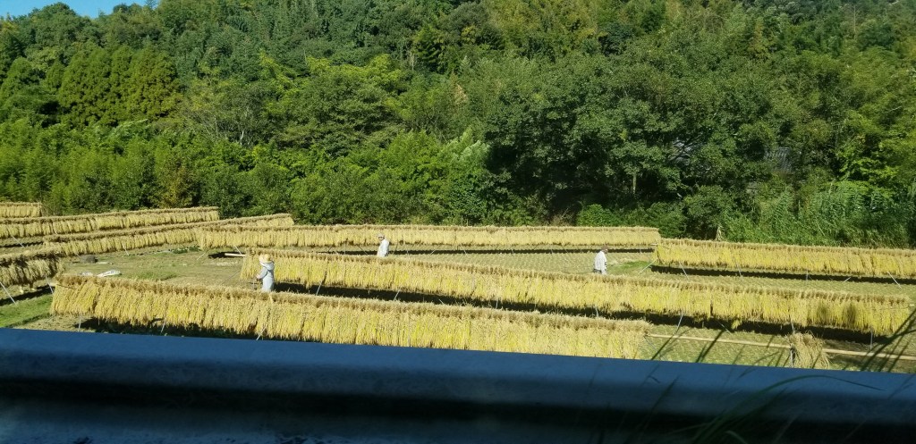 Et que dire de la nature! Je vous ai déjà parlé de la forêt, si luxuriante, intensément verte et magnifique. Les rizières sont remplies de séchage. Ils ont installé des supports sur lesquels ils font pendre à l’envers, des bottes de tiges de riz.