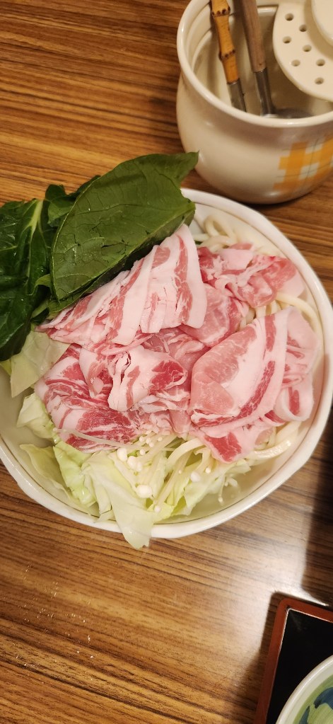 Mais en attendant, le souper typique japonais familial nous attend. Il est délicieux. Un genre de bouillon japonais où on fait cuire des tranches de porc et des légumes. La dame récupérera le bouillons pour y mettre du riz et des œufs pour en faire un risotto japonais.