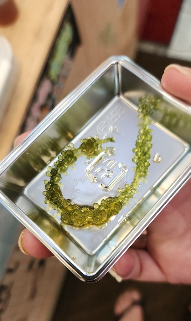 Par contre, on a goûté à un légume de mer ou une algue (je sais pas trop) vendu comme les raisins de la mer. Une petite branche sertie de petites boules toutes serrées ensembles. Je m’attendais à une explosion d’eau salée, un peu comme avec le caviar, nenni! Un petit croustillant et un goût impossible à décrire mais délicieux. J’en voudrais dans toutes mes salades! L’effet texture et goût est excellent!
