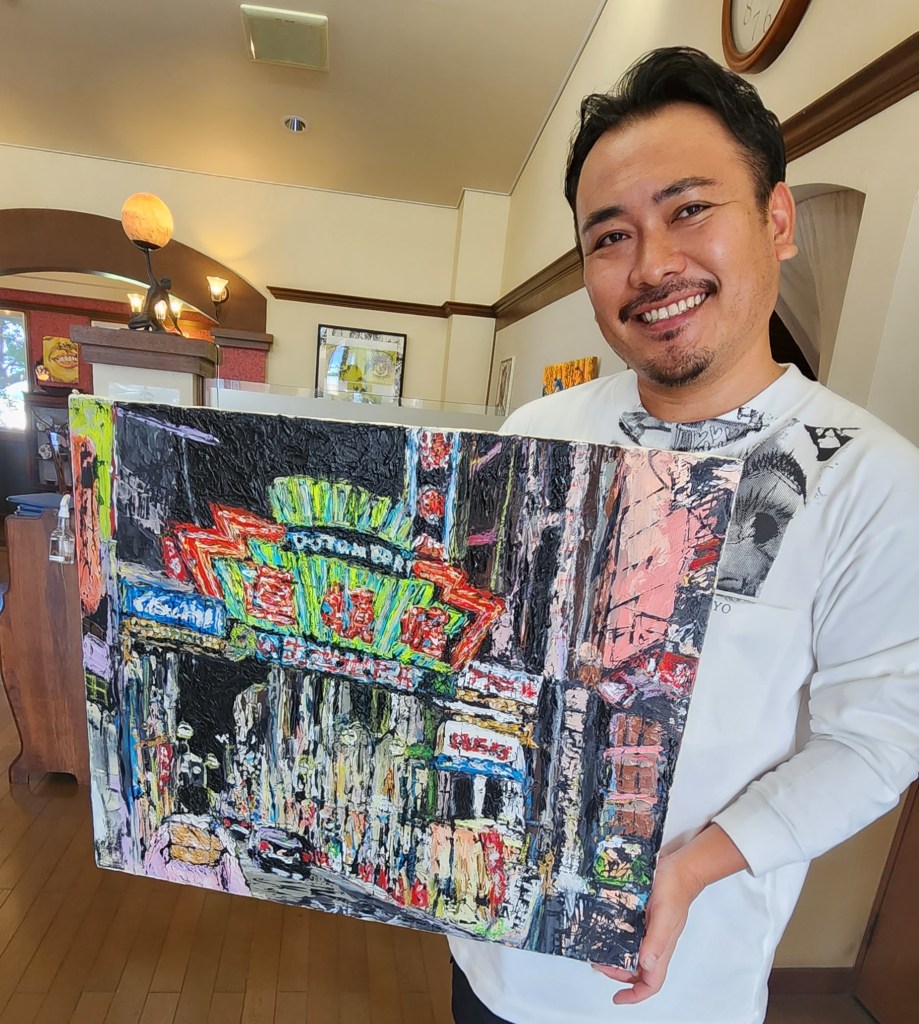 Je dis ça à notre gentille serveuse qui s’exclame: it’s my husband l’artiste!! Et le husband de sortir de la cuisine. Et on fait le tour des toiles avec des wow! Je suis en amour et j’en veux une. Mais ça doit coûter une beurrée… mais je tâte le terrain. Trop cher. Il me dit, tu peux payer combien? Je lui dis que je suis gênée parce que je respecte son art. Il me dit, combien? Je lui dis, il me dit ok! Omg! J’aurai une toile d’un artiste local de Okinawa chez moi!