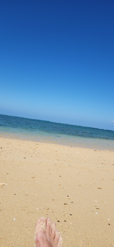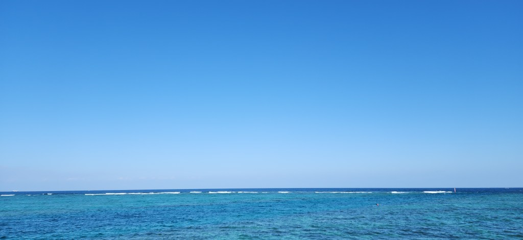 D’ailleurs, la plage et la côte sont protégées par une grande barrière, des récifs de coraux au loin. Quand la marée est basse, elle apparaît clairement à l’horizon. Les vagues s’y fracassent dans un grondement quasi assourdissant. C’est magnifique.