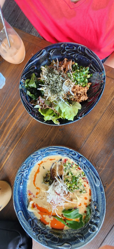 Mes amis, le repas était délectable! Une belle soupe onctueuse et crémeuse sans crème. Et l’assiette de pâtes à Sacha, un délice aussi. Nous avons été enchantées par ce resto grano bio, le café-bar Gajimaru.