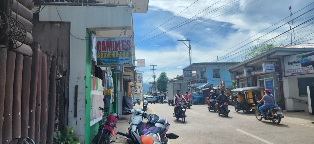 Coron, on est arrivées un peu dans le chaos du débarquement du bateau. On se ramasse dans un tricycle qui nous roule ça mes amis, à la vitesse chaotique de la lumière! Il semble bien que la ville est traversée par une rue principale bien animée.