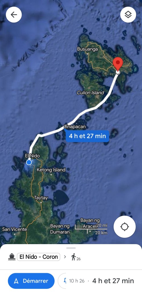 Nous voilà maintenant à Coron! Bien au nord de Puerto Princesa. 5 heures de route et 5 heures de bateau. Levées à 4:30 et arrivées vers 19:00 au Lodging house. Le gars me dit: you look tired m’am, avec un petit regard un peu concerné. Ben mettons que la journée a été longue, chaude et assise pas mal. Et la connexion entre les deux transports ne nous a pas permis de manger ben ben. Une chance que nous avions des grichenouches ramassées lors de notre tour de ville de la veille!