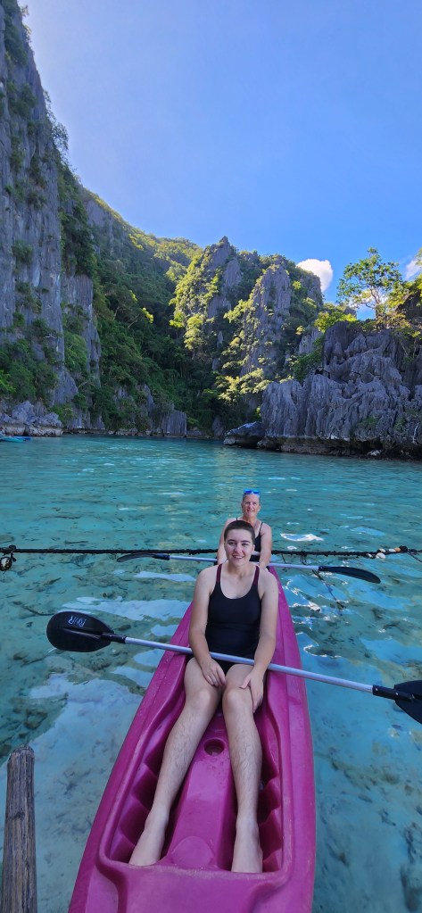 On a fait du kayak dans deux lagons, dans Twin Lagoons. Vraiment impressionnant cet endroit. On se retrouve devant des cathédrales de roche déchiquetée (c’est pas mal la thématique dans ce coin de pays) et on flotte sur de l’eau turquoise translucide. C’est fou le contraste entre l’eau turquoise, les formations rocheuses noirâtres et la végétation d’un petit vert tendre comme le vert du printemps à la maison. Le son se réverbère partout, l’eau est chaude et cristalline et nous sommes seules!