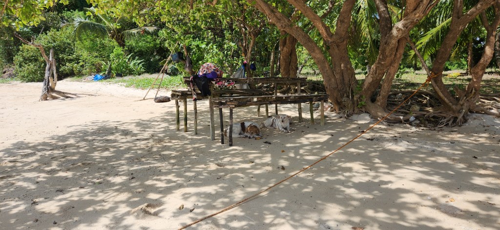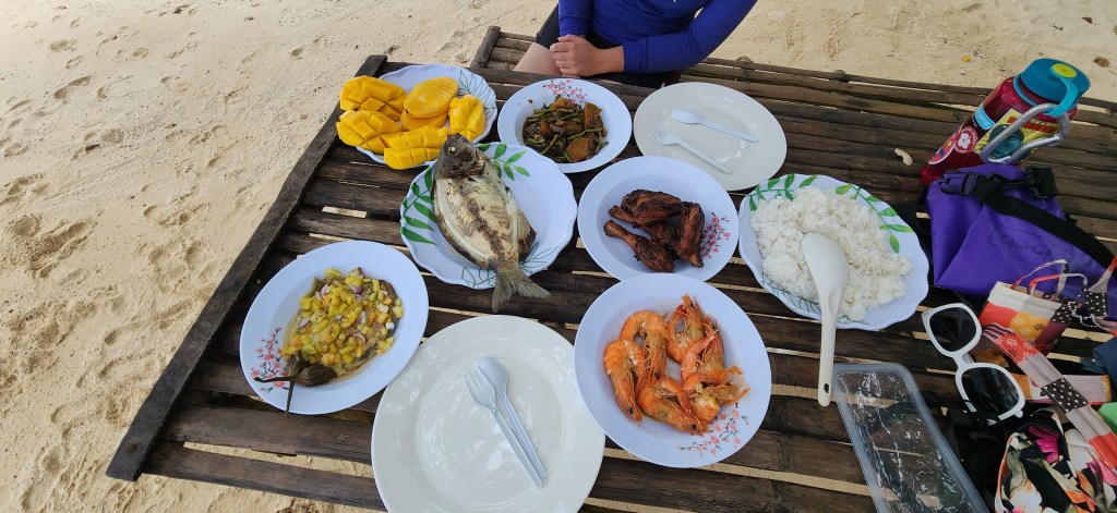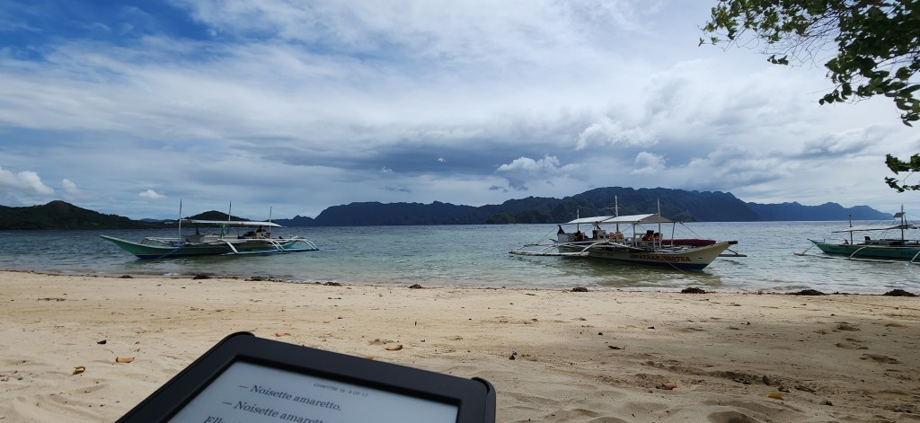 Les repas se prennent sur une plage. Nous avions deux jours, deux repas donc et deux plages. Aux deux endroits, nous sommes restées tranquilles, à l’ombre, en Cawo-Sacha qui lisent. Vous savez nous, la plage, c’est bon pour la baignade et la lecture. Très peu pour nous la crêpe au soleil! Je crois que notre équipe était un peu perplexe mais ils sont tellement gentils, ils nous ont laissé tranquilles. C’est tout de même agréable de pouvoir lire au son des vagues! Nous avons profité un peu plus de la seconde plage, Banol beach, qui est d’un sable blanc magnifique, avec des hauts fonds qui permettent d’aller loin au large.