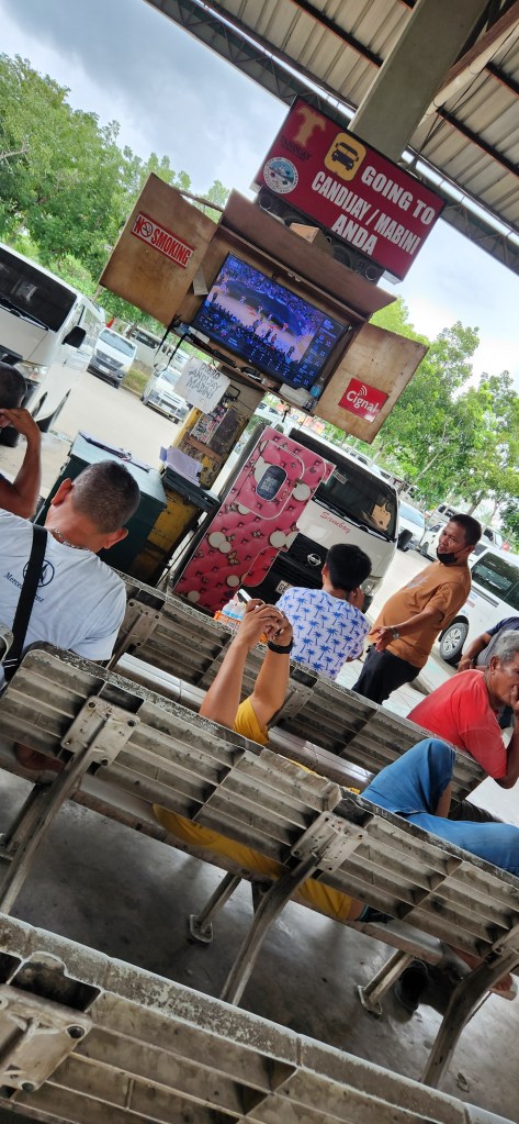 C’est toujours un peu difficile de savoir à quoi s’attendre avec les stations d’autobus. Certaines sont minuscules, comme celle des autobus de Banaue, souvenez-vous lecteurs avides. Et d’autres sont grandes, bien organisées comme celle de Tagbilaran. Souvent c’est un peu le chaos aussi. Mais celle-ci est bien tranquille, vaste. D’un côté, les autobus, de l’autre les van. Nous. on va du côté des van. Direction Anda.
