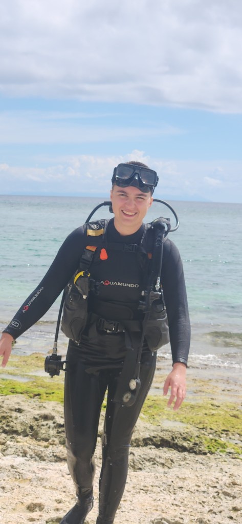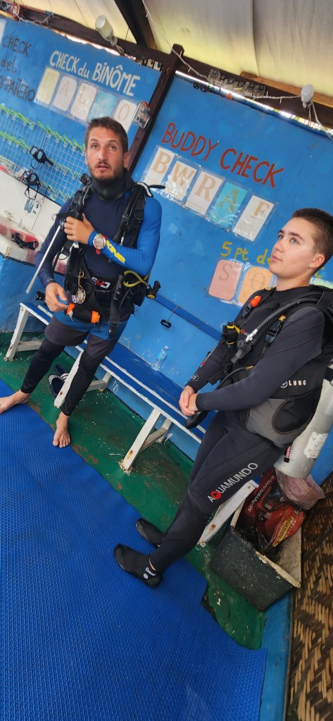 Et aujourd’hui, snorkeling en matinée avec la grande. Nous avons vu une belle grosse tortue! Et par la suite, madame Sacha Lebel ici présente, a eu son baptême de plongée sous-marine! Oui mesdames et messieurs!!! Une très grosse heure avec Emeryc qui l’a coachée et amenée avec lui au large, là où le fond devient un mur pour découvrir la vie sous-marine à son meilleur: tortues de mer, murènes et des poissons à profusion.
