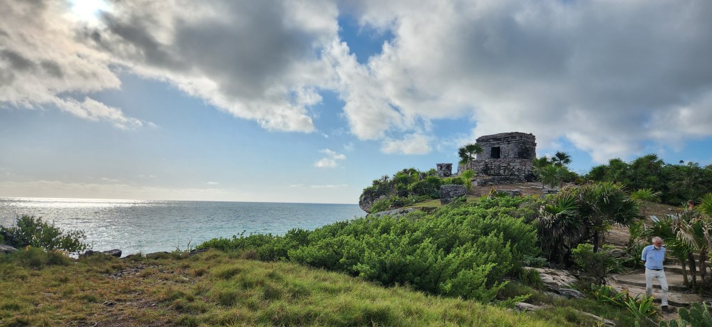 Nous avons marché sur le site et contemplé aussi la mer pendant une grosse heure et demi. Tranquilles la plupart du temps. Ça vaut la peine d’y aller tôt sérieusement. Mais un guide aurait été bien, pour s’imprégner du site. Nous en aurons un pour Chitchen Itza. Ici, à Tulum, c’est comme un réchauffement à ce qu’on va voir après demain!