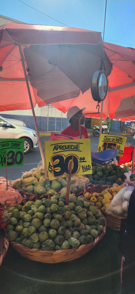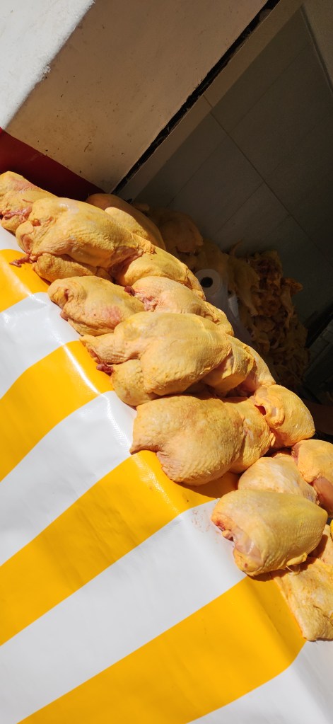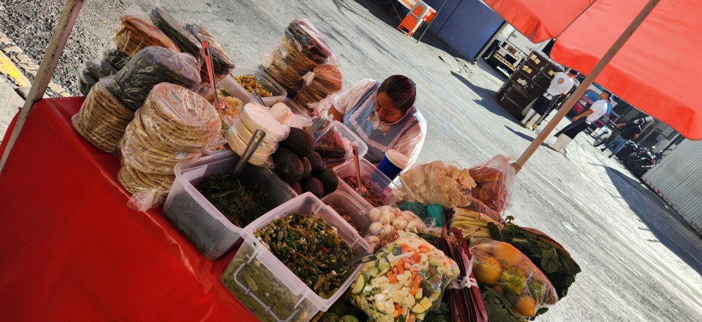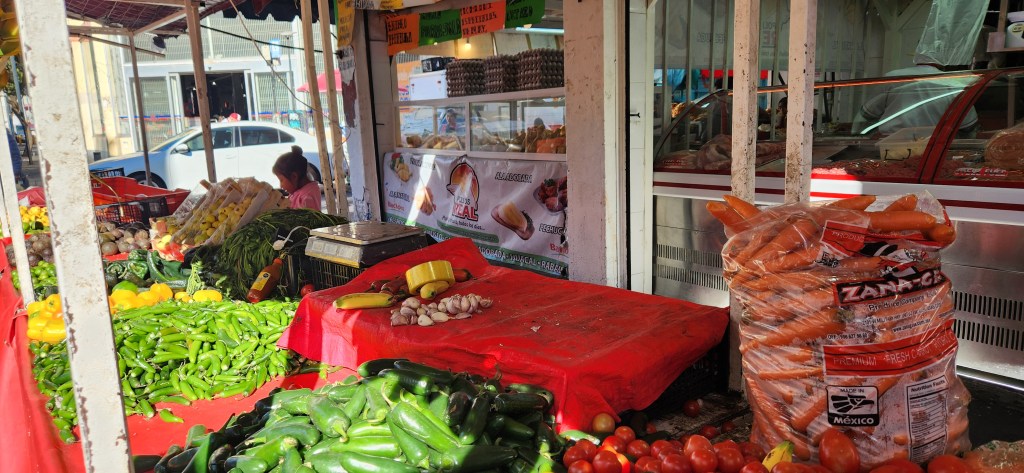 Le matin ça bouge de partout. Cette fois ci nous sommes tombées sur la rue du poulet. Des poulet partout, couchés sur de la glace. Entiers pour la plupart. Et évidemment, les petits resto de rue vendent quoi? Et oui, des tacos, tortas et autres au poulet! Tout plein de kiosques de fruits et légumes aussi s’entassent sur le bord du trottoir.