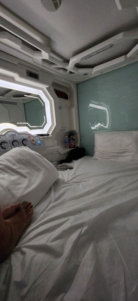 Sacha et moi, on adore ça les capsule hotels! Entrer dans un petit cocon tout enveloppant. Surtout quand on est toujours dans des lieux publics où presque, en voyage. Se retrouver dans un petit espace juste pour soi, c’est vraiment bon.