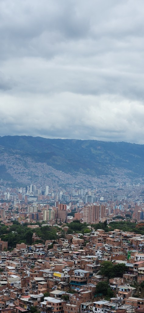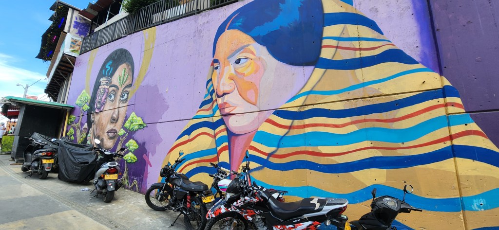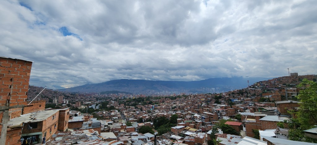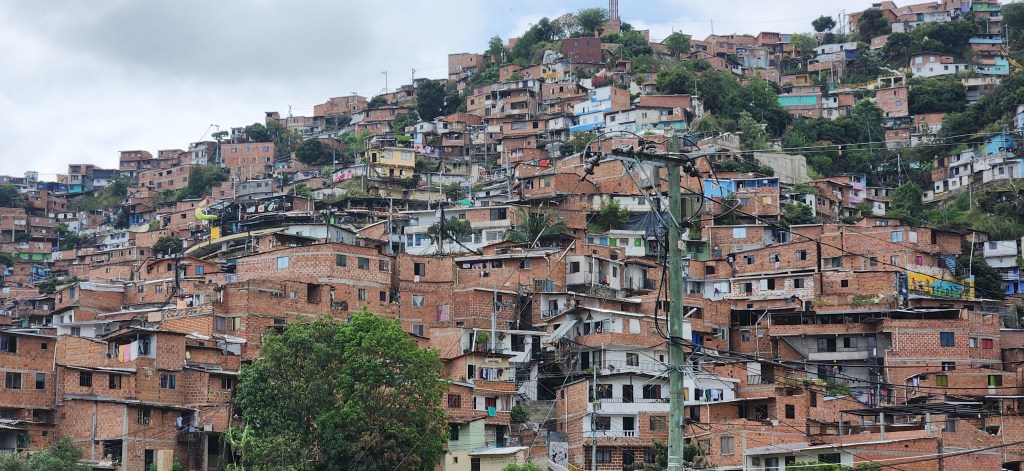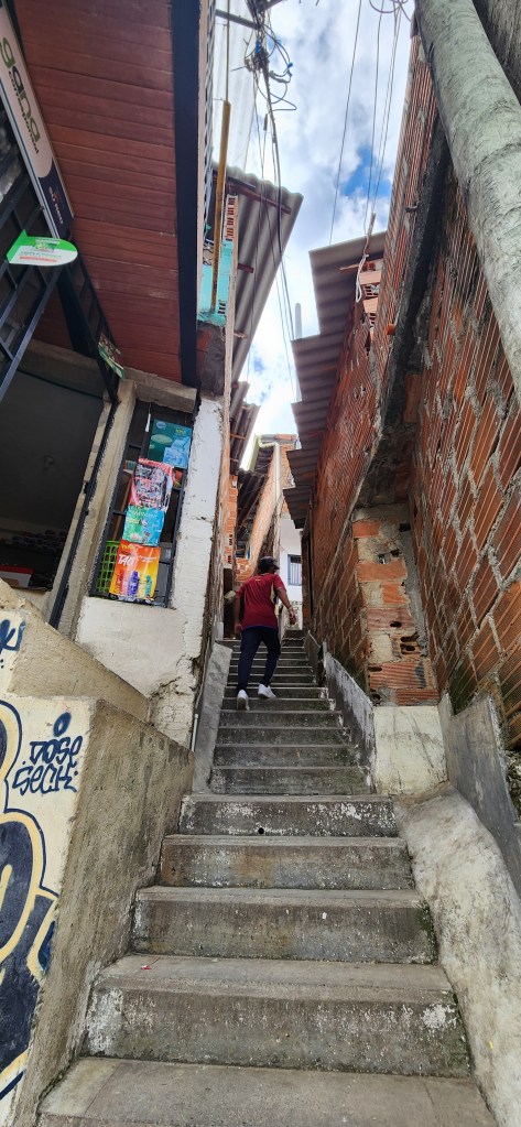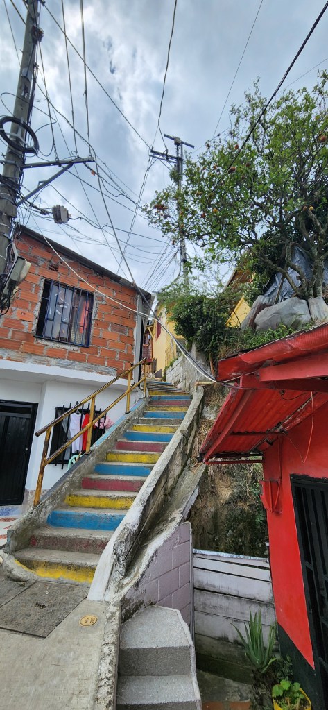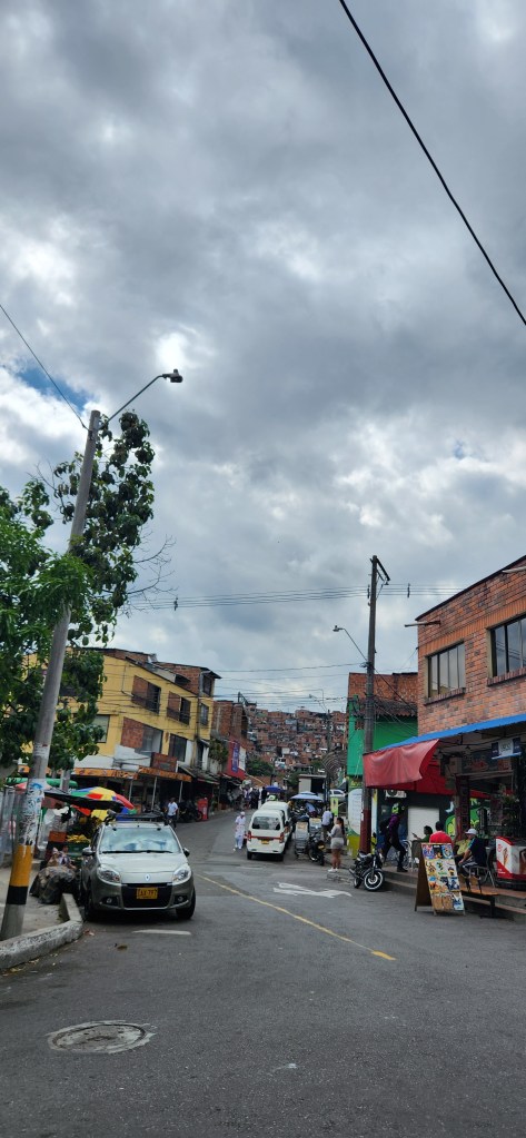 Comuna trece a reçu la cote 1-2. On entre dans la grande pauvreté donc. Mais Comuna trece vit actuellement une revitalisation importante et aussi un regain de visibilité auprès du tourisme. Pourquoi? L’art de la rue. Depuis longtemps les gens de la Comuna (et probablement ailleurs aussi à Medellín) expriment leurs revendications, histoires etc par de grandes fresques sur les murs de béton. Ils ont décidé de les partager avec les autres. Créant des tours pour les touristes. Et de là, l’apparition de shops de toutes sortes, de spectacles, de galeries d’art, etc.