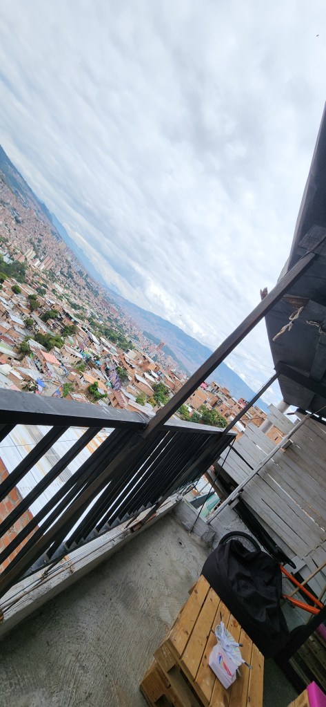 Nous avons mangé chez Diana. Elle nous a accueillies chez elle, une petite maison juchée tout en haut. Maison modeste mais bien tenue avec probablement la terrasse avec la plus belle vue de Medellín. Petite soupe aussi bonne que celle de ma mère avec des herbes salées du bas du fleuve genre. Et plat principal habituel: riz, fèves rouges, banane plantain grillées et poulet. Il y avait une salade aussi mais je préfère pas manger de cru. Au grand désarroi de Eve qui aimerait bien manger des légumes.