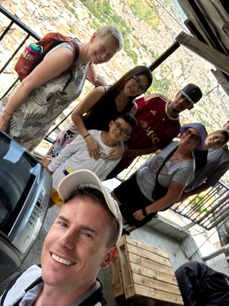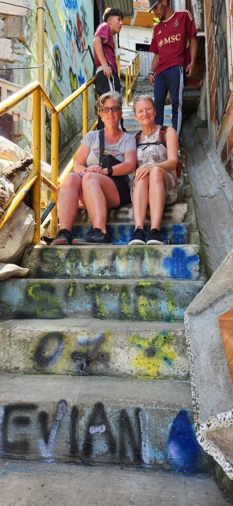 Nous avions choisi une excursion immersive. Aller dans la Comuna 13, la vraie, accompagnées d’un guide habitant la Comuna, avec Jonathan comme traducteur quand le débit dépasse la vitesse de la lumière. Nous étions chanceuse, nous avons eu droit à 2 guides locaux, deux Santiago, pour le prix de un!