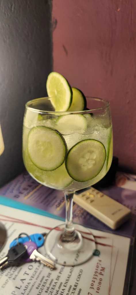 En haut complètement? Le resto bar avec une terrasse surplombant la mer. Mais on voit rien tsé. Il fait vraiment nuit noire! Je me commandent un bon Ginto. Il est délicieux! Ça fait du bien! Ça remet de ses émotions!
