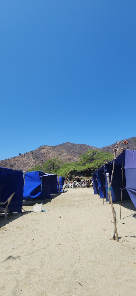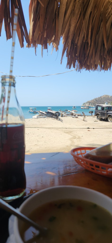 Nous découvrons tout plein de petits pavillons arrondis placés sur les abords de la playa, la playa des pêcheurs. Des petits restos typiques colombiens où on sert le classique « comida del día », soupe et plat principal.