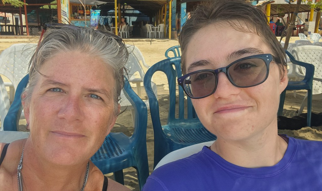 Roger, c’est avec lui qu’on est jumelées, nous propose des chaises devant l’eau. Il dit 3000 pesos chaque. Ok parfait!