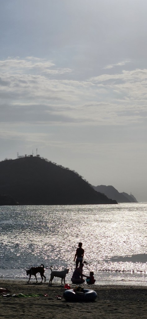 C’est paisible cette belle lumière qui ajoute une teinte dorée à tout. Les gens et les chiens sur la plage sont en contre-jour, c’est magnifique. Mais il faut être rapide, on a pas droit à des couches de soleil éternels comme à Trois-Pistoles! Ici, on est très près de l’équateur. Le soleil se lève à 6hre et se couche à 18hres. Le coucher du soleil commence à 17:55, genre!