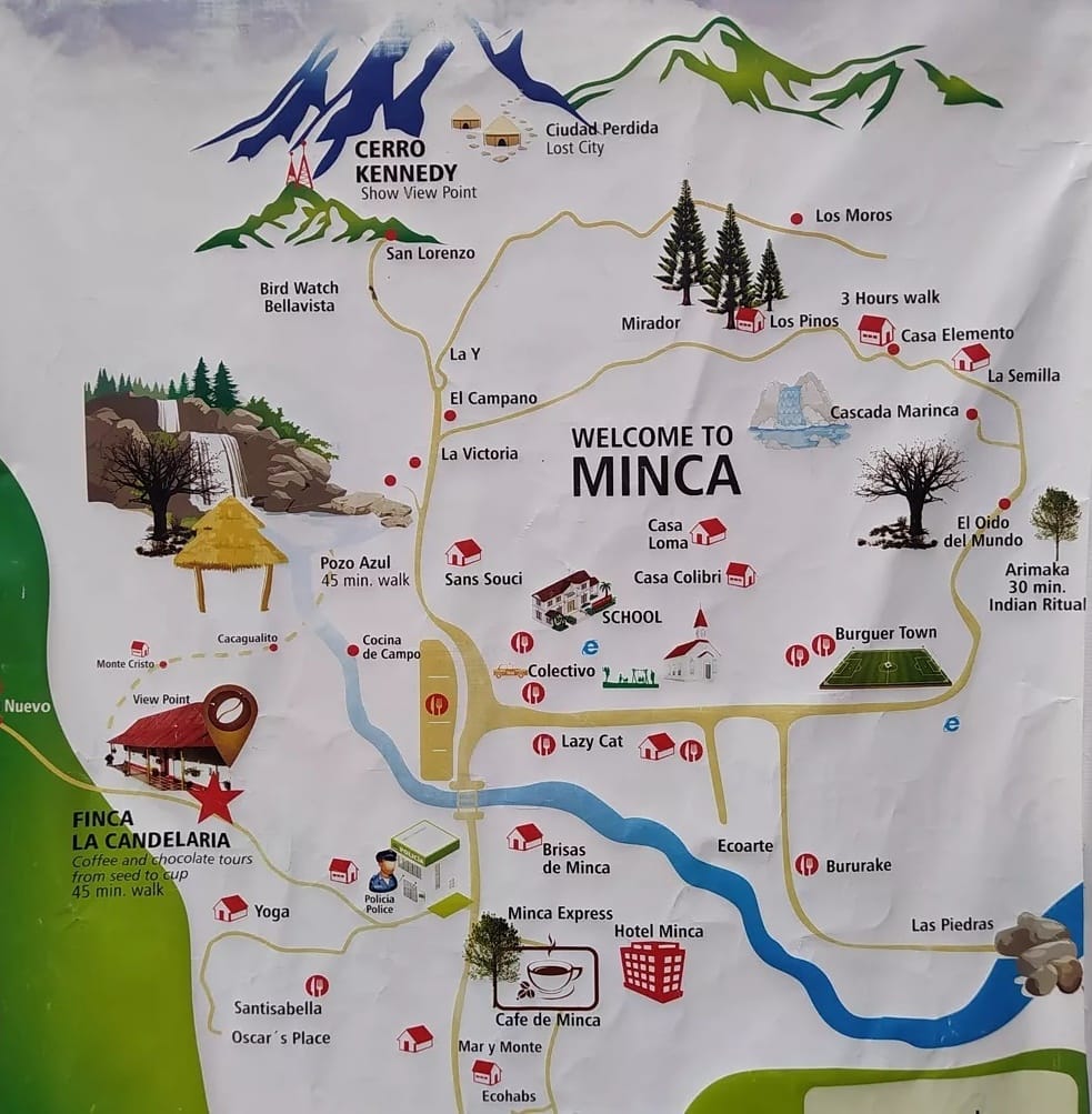 Donc, vamos à Minca. Joli petit village. Grand comme ma main. 3 rues, un mini centre de village. Très touristique mais de backpackers. Eux, ils ont pas d’argent. Y a pas de surenchère sur les prix. On trouve facilement plusieurs resto qui offre la comida del día, super délicieux à 17 000 pesos. Un prix normal et qu’on trouve partout sauf à Taganga!