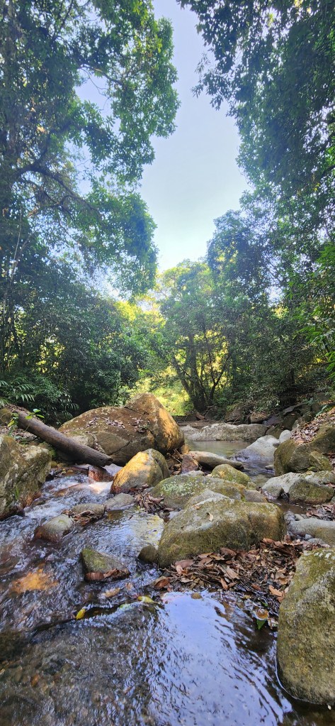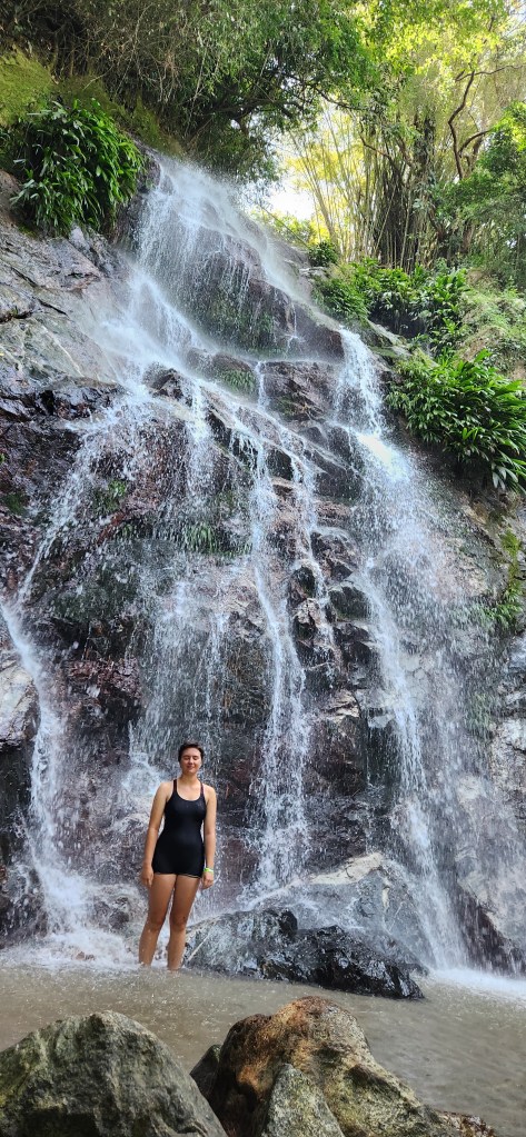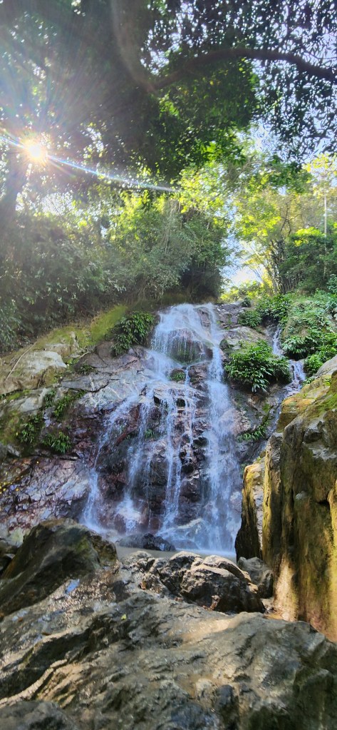 Nous poursuivons notre petit chemin tranquillement. Et après quelques montées plus abruptes (dans lesquelles nous avons l’impression de nous diluer tellement nous suons), nous arrivons à l’entrée de la cascade.