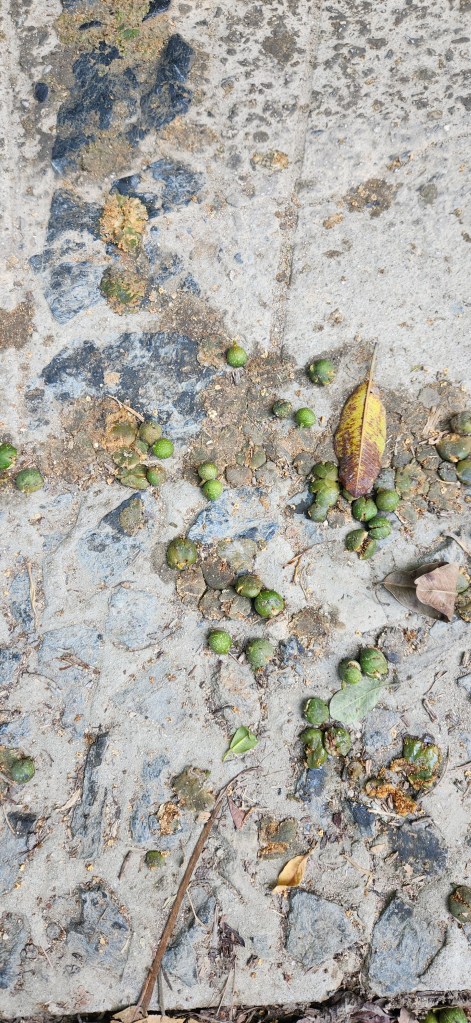 On sent un léger parfum de fruit, mélange de banane non mûre et d’une céréale quelquonque. Difficile de déterminer. Mais j’aime cette odeur. Très fraîche et nourrissante on dirait. Et je regarde par terre. Il y a une multitude de petit fruits verts, gros comme des prunes rouges, écrasés par terre. Ils tombent des arbres avoisinants. C’est ça l’odeur que je sens. C’est bon la nature.