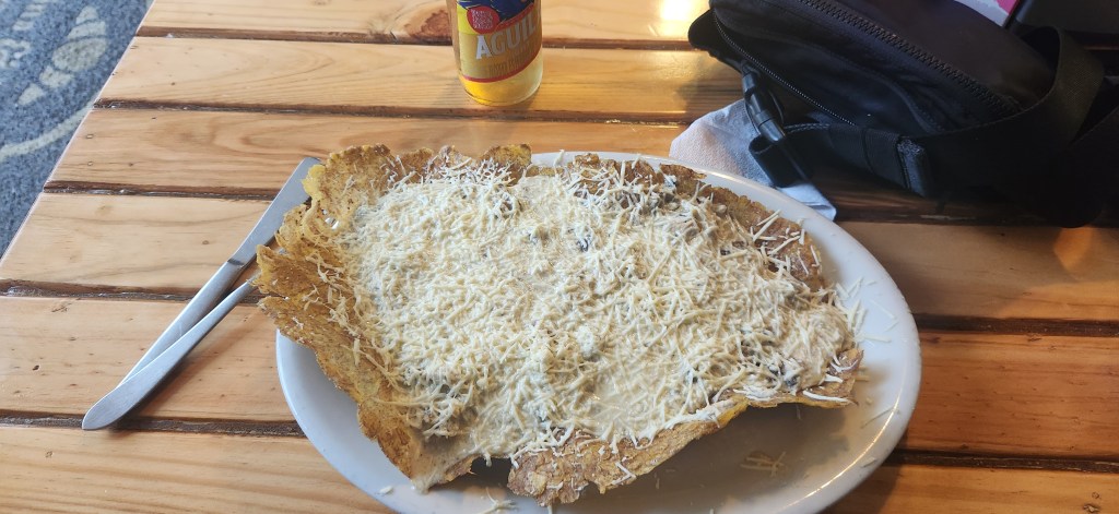 Ici, à Salento, ils font des genre de crêpes ultra fines, bien croustillantes, de banane plantain sur laquelle ils mettent toutes sortes de garnitures. Je prend poulet, champignons et fromage. Intéressant comme plat. Vous verrez la photo.