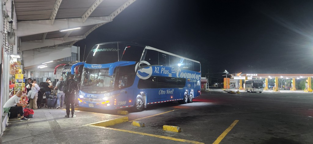 Je vais vérifier le billet acheté en ligne. Tout semble en ordre. Le monsieur me dit qu’à 22:00, je saurai le numéro du véhicule. Notre autobus part à 22:30. Nous devons arriver à 6:00 à Bogota.