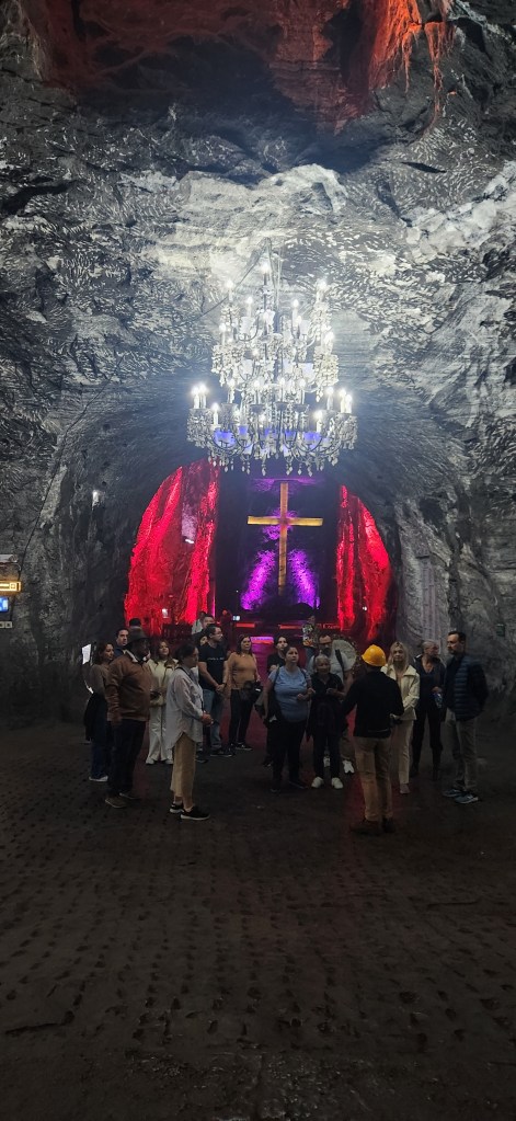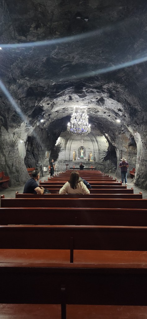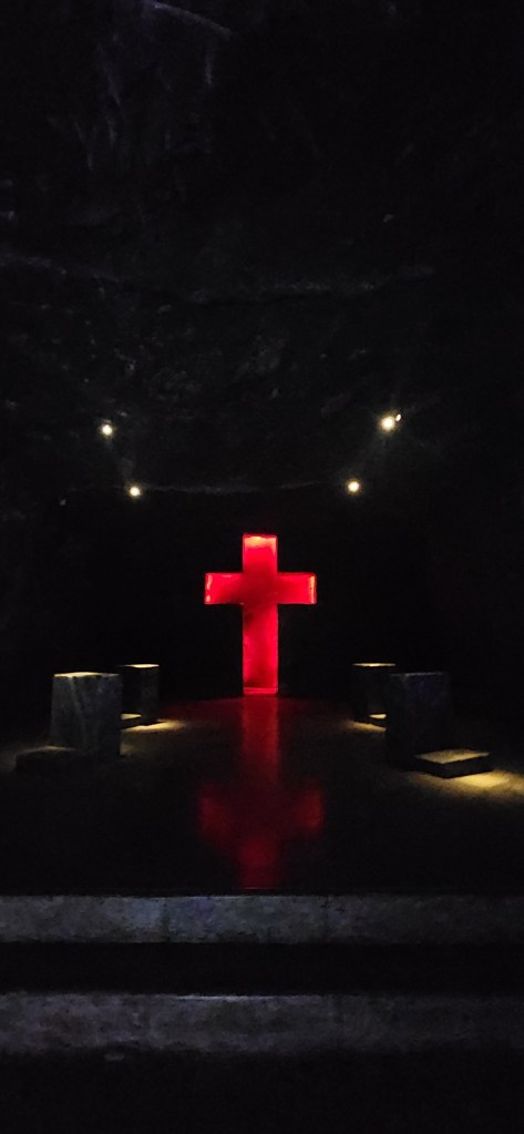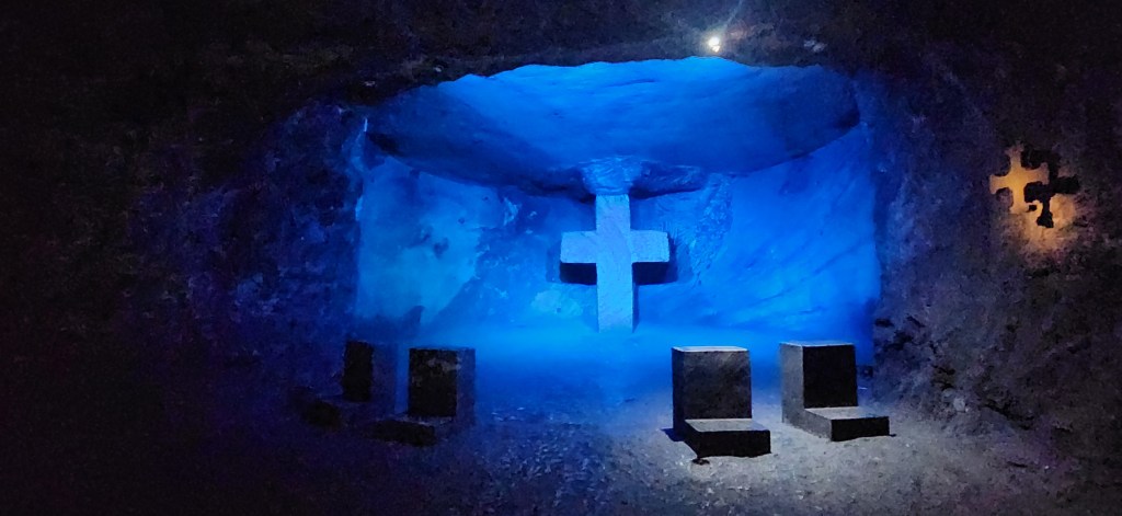 Et c’est là que je réalise que nous allons faire un chemin de croix! C’est ce qui a été construit dans cette Cathédrale. Toutes les stations de la passion du christ sont sculptées dans le roc et le sel. Des croix énormes, représentées différemment en fonction de la station. Des lumières pour agrémenter le lieu et des prie dieu… pour… ben… prier dieu.