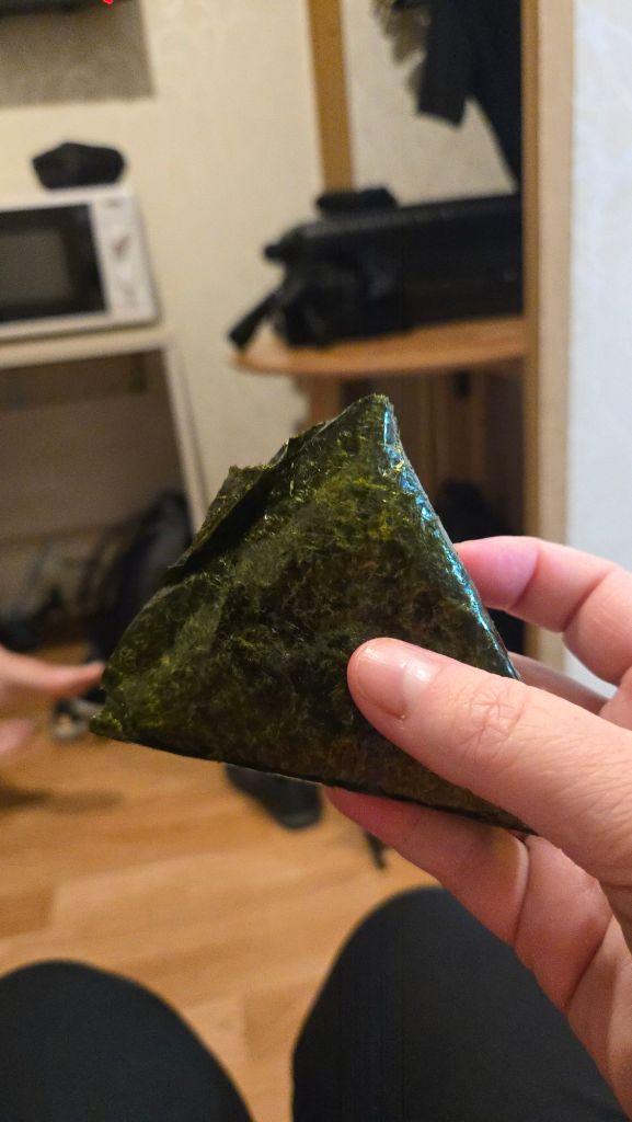 Il est parfait le studio. Et nous, ben on est vraiment crevées. Alors n’écoutant que notre courage et, surtout pour moi, ma tradition, on va se chercher notre premier repas au Seven-Eleven du coin! Et qu’est-ce que votre écriveuse se rapporte? Un onigiri au thon et mayo voyons!!! La tradition svp!! Avec un petit drink acidulé pas piqué des vers que j’aimais bien boire il y a deux ans. Une bête de routines cette fille!