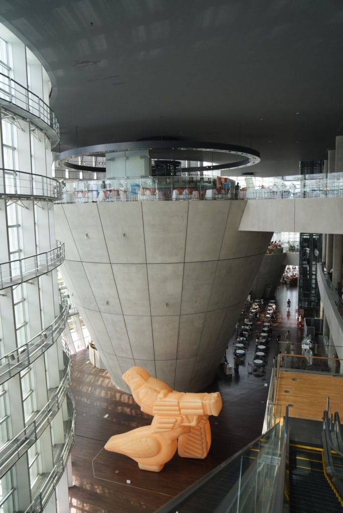À l’intérieur, c’est grandiose. Vraiment. Le mur de verre est magnifique et on retrouve deux cônes inversés qui semblent flotter accrochés au 2ieme et au 3ieme, ils abritent un café et un restaurant. (Voir photo itou). Se promener dans ce volume est vraiment cool. Juste ça, ça valait le déplacement.