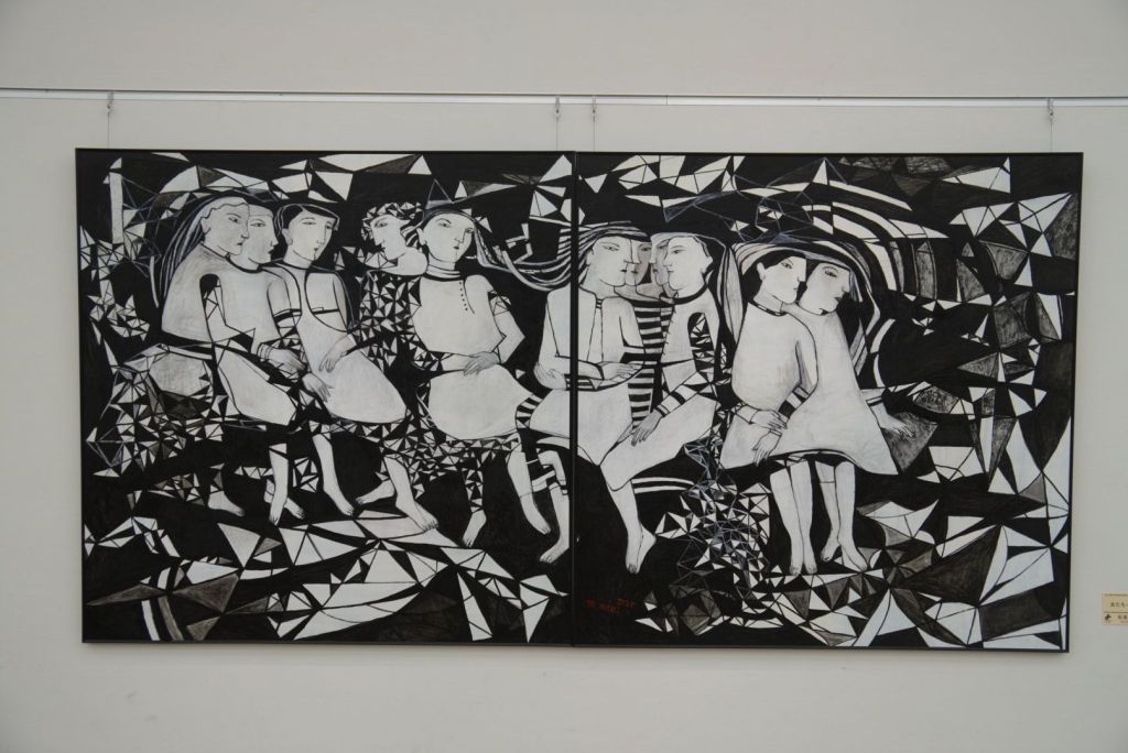 La première partie touche principalement la sculpture et l’art textile. Un genre de salon des artistes car plusieurs d’entre eux étaient présents. J’ai même jasé avec une artiste, en français svp. Artiste textile qui présente une gigantesque toile imprimée de motifs noirs et blancs. J’aime!