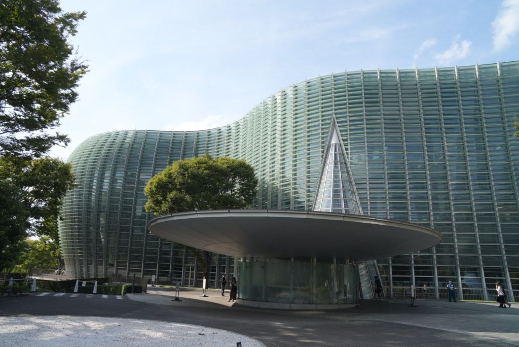 Il s’agit du Centre d’art national de Tokyo. Déjà, l’édifice est magnifique. Un gigantesque mur de vitre en façade. Il est vraiment long et courbé. En son centre, une sorte de soucoupe volante abrite des supports pour les parapluies.